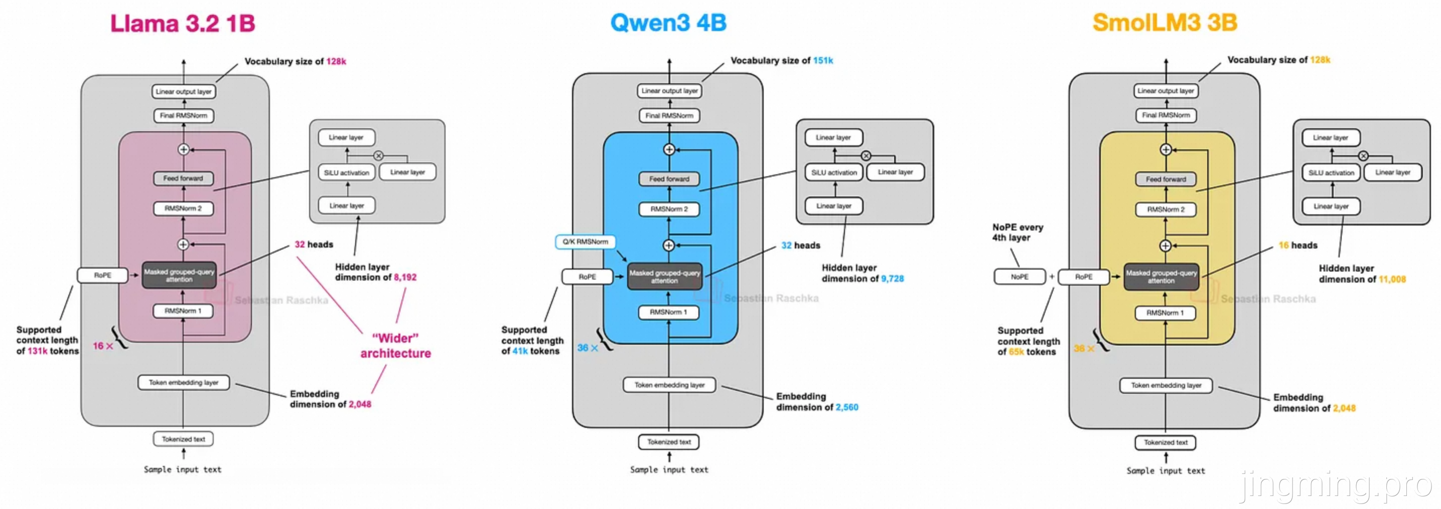 如果把视角切换到底层结构,会发现从早期的 GPT-2 到如今主流的模型,大多数模型的架构依然建立在 Transformer Decoder-only 之上,并没有发生颠覆性的变化。对比 Qwen3、GLM,Llama 等开源大模型,它们在结构上高度相似,差异更多体现在具体模块的实现方式以及参数配置方面。