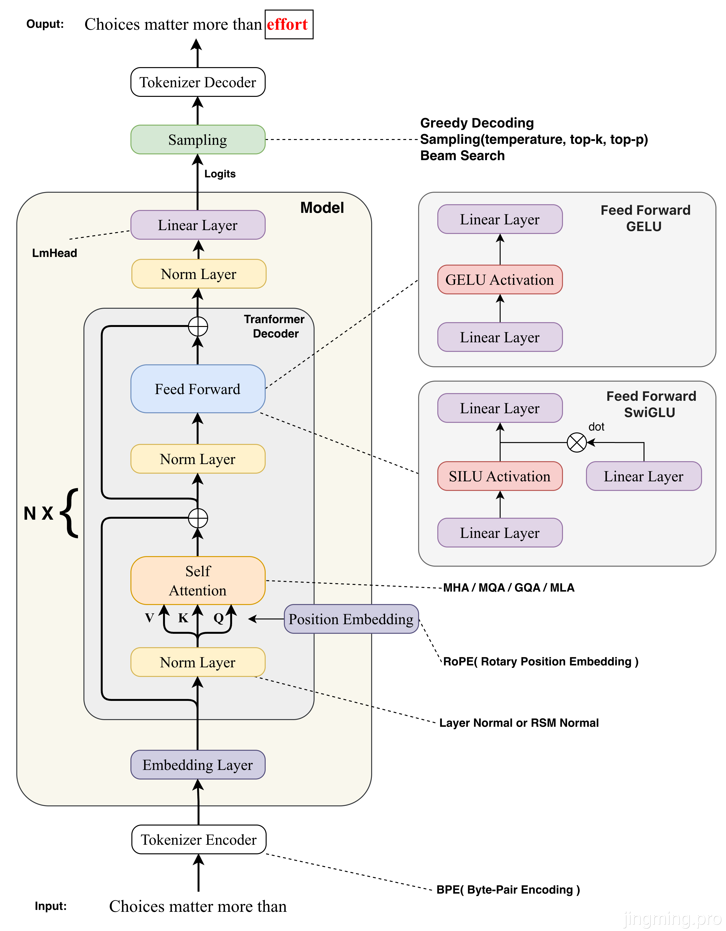 当理解了这套基础结构及其推理流程,再去看其他大语言模型的论文或源码就会容易很多。从零构建一个大语言模型,就像搭积木一样,只要理解每个模块的功能,再按照合理方式将其拼接起来,就能搭建出完整的模型。