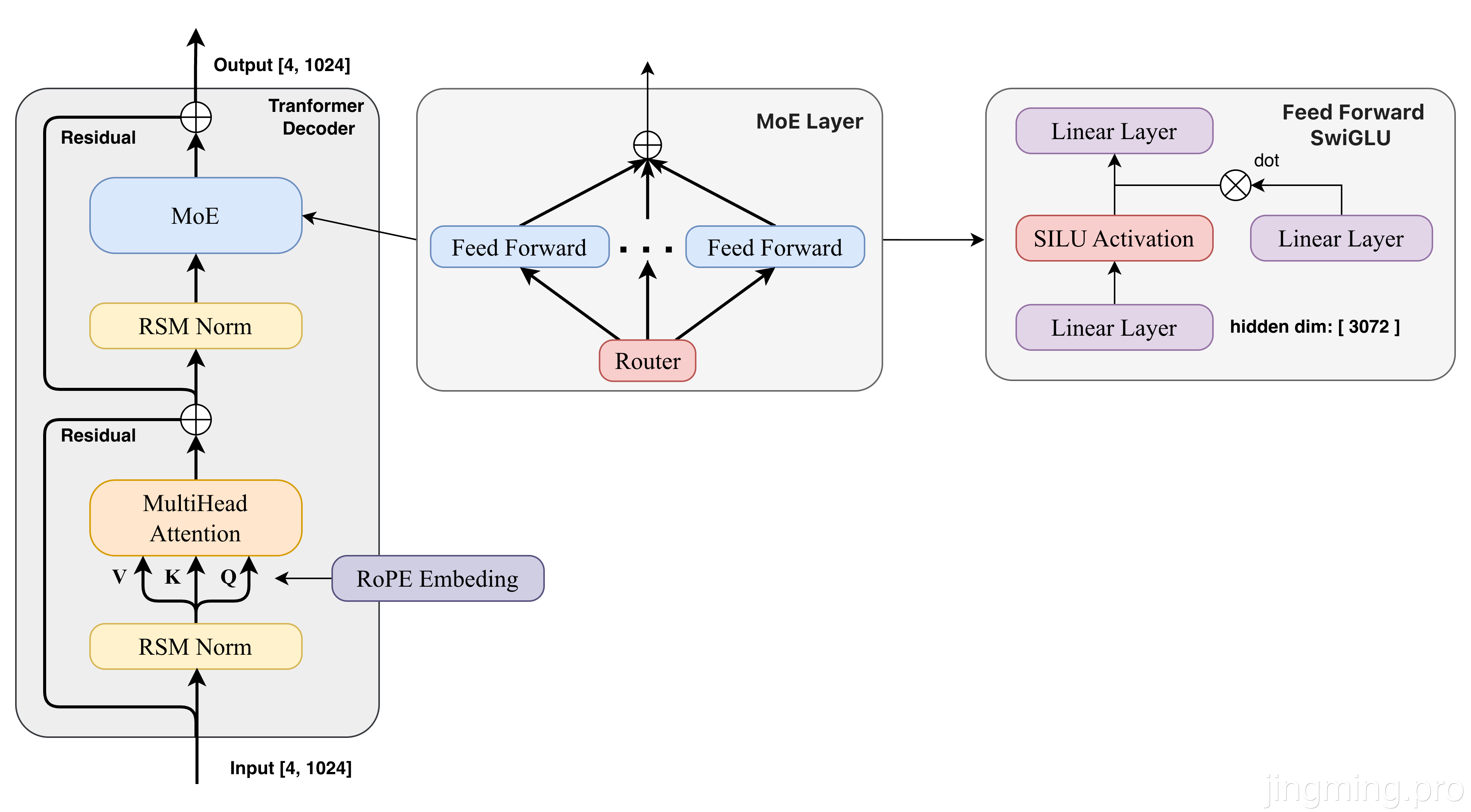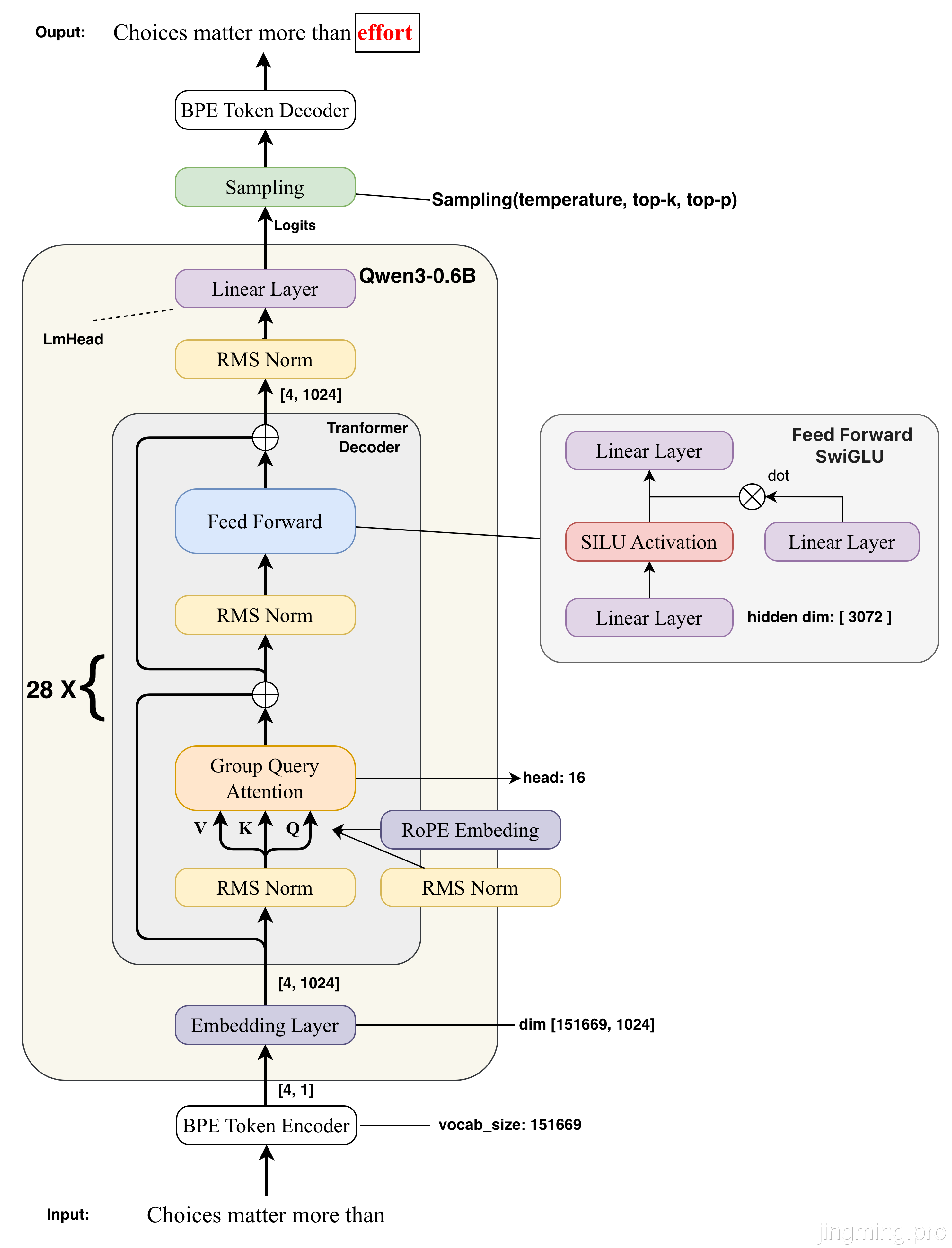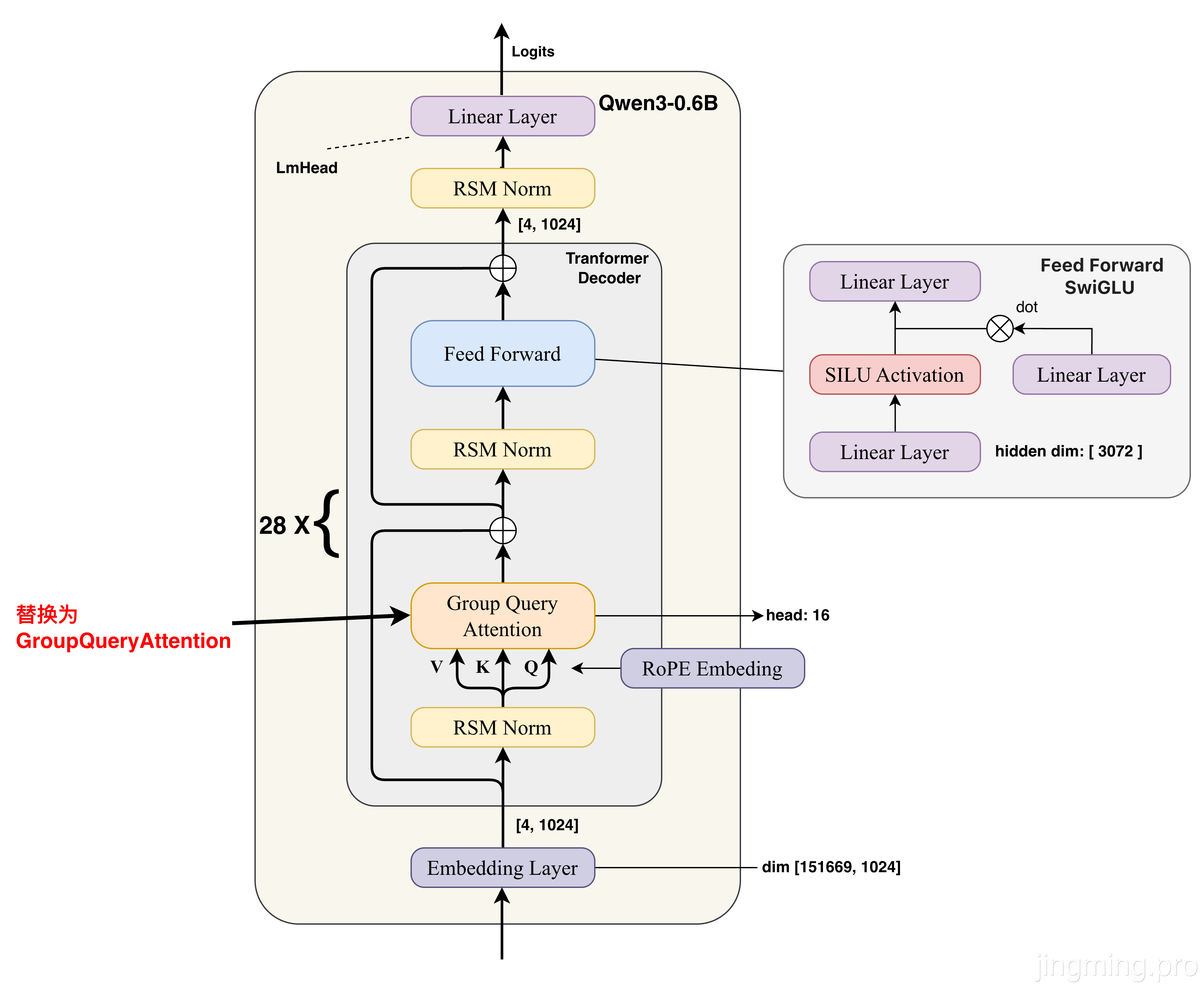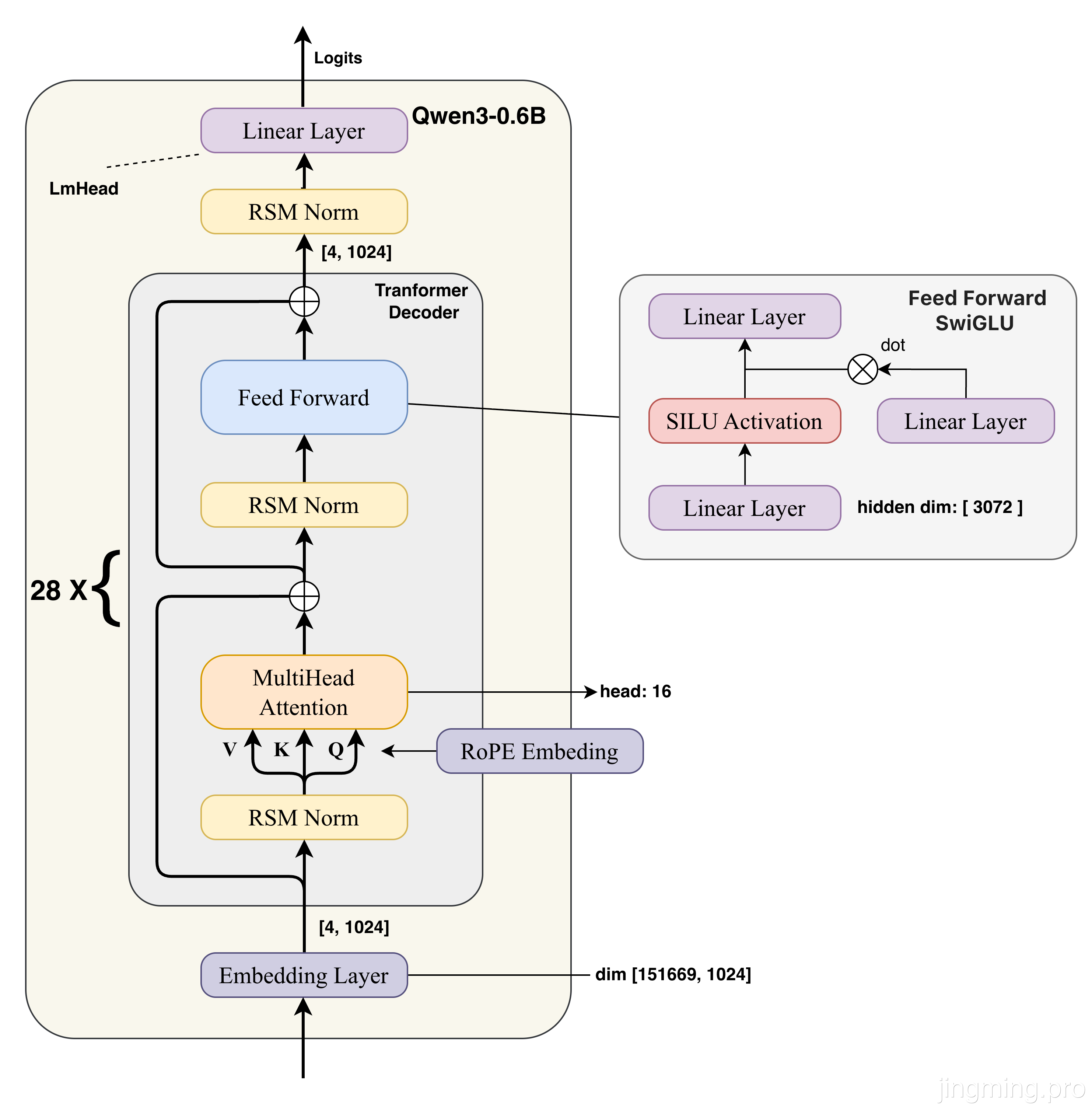 本文将以 Qwen3 的模型结构为基础,沿前向传播的路径,逐步介绍各个模块的作用与原理,并给出对应的 PyTorch 代码实现。在此基础上,我们将进一步把这些模块组装成一个完整的 Qwen3 模型,最后通过加载 Qwen3-0.6B 的预训练权重,对模型进行推理验证。