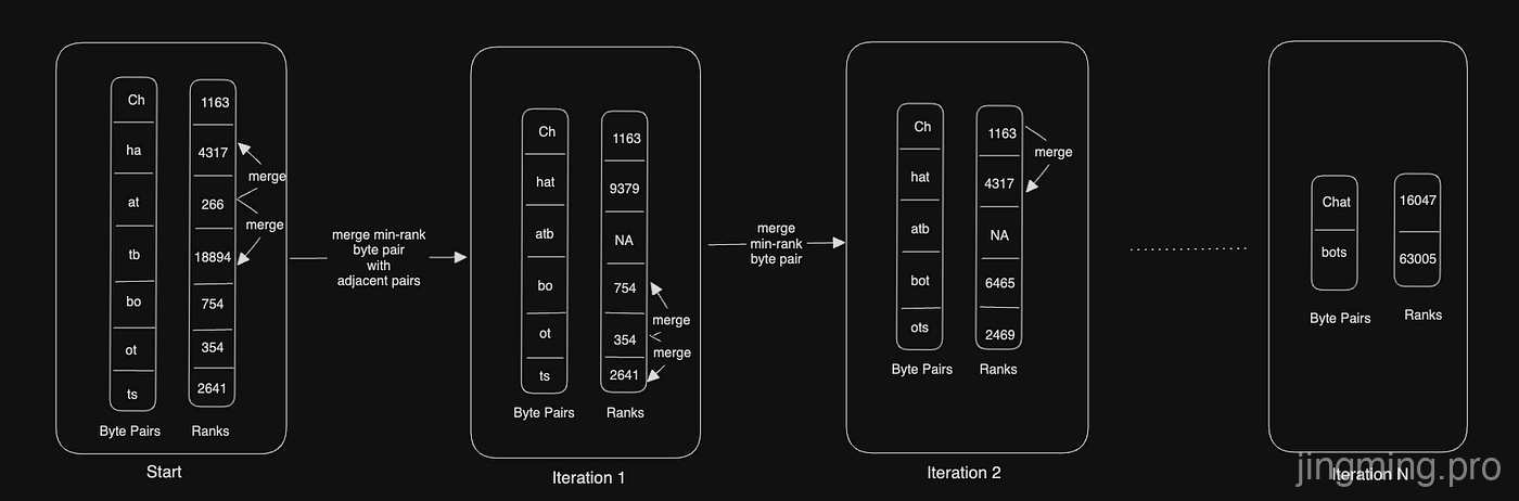 注意这里的基础符号可以是字符,也可以是字节,但在实际工程实现中,分词器往往以字节作为底层的初始表示,为了便于说明,例子仍以字符为单位进行演示。