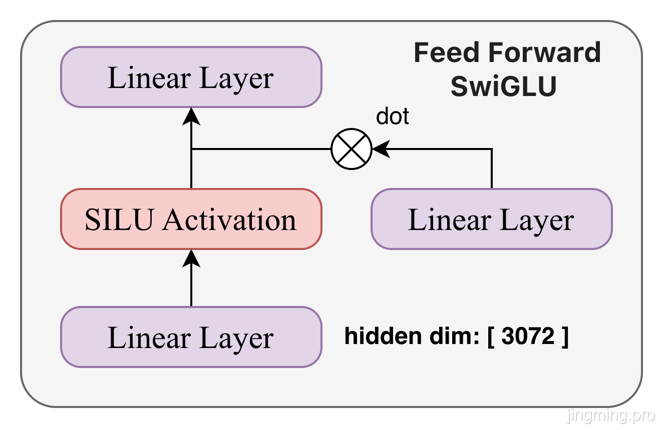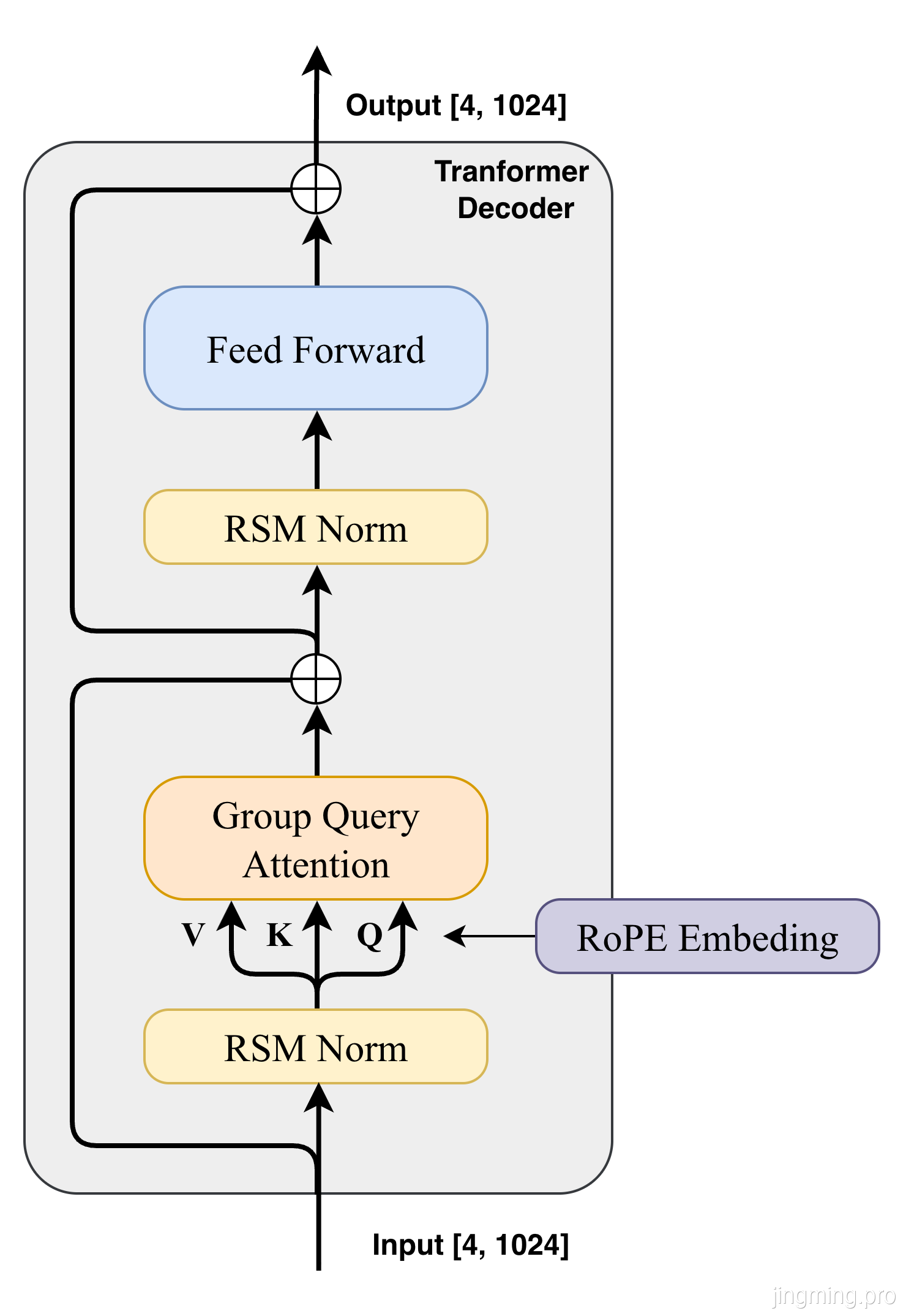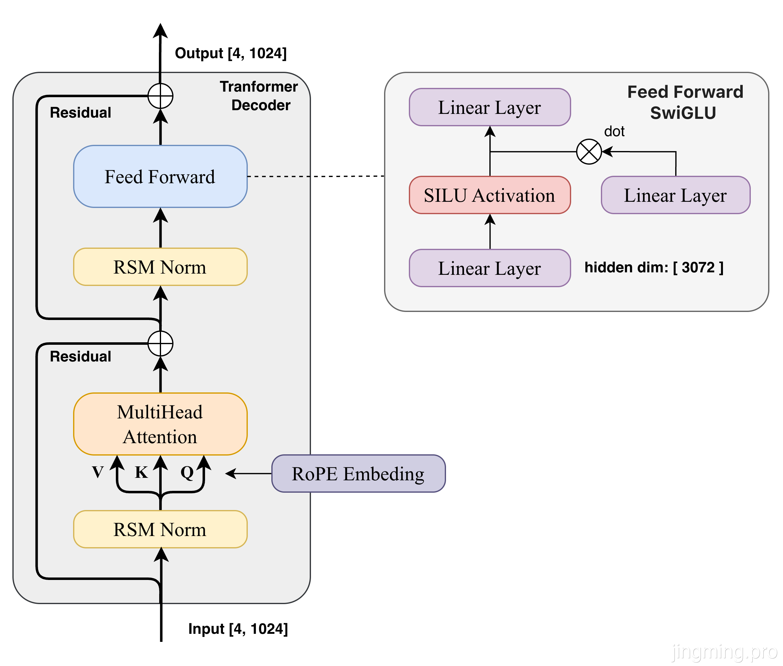 Transformer Decoder Block:包括 RMSNorm、RoPE、注意力机制、SwiGLU 前馈网络和残差连接,是模型提取上下文特征和建模语言规律的核心;
