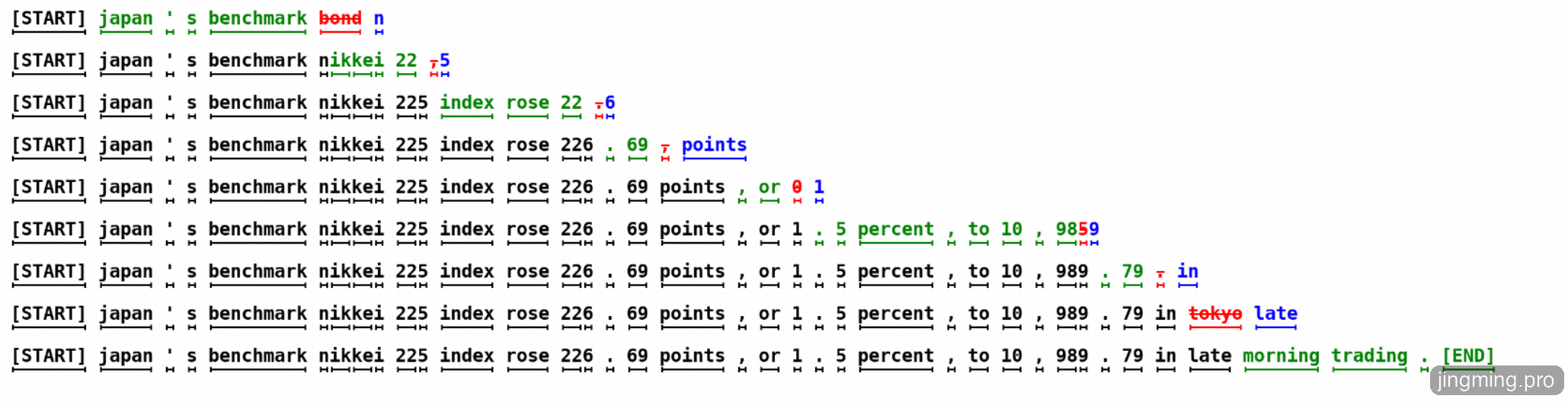 下图中,每一行代表一次迭代,由草稿模型预测的token,目标模型判断是否接受这些token,绿色表示接受,红色表示拒绝,蓝色是大模型给出的修正。