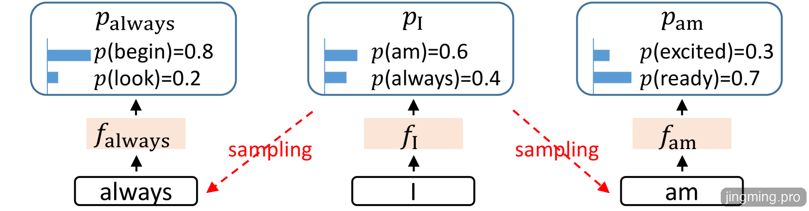 Token采样过程是随机的,采样不同的Token会导致下一个特征$f_{t+1}$明显分化,所以$f_{t+1}$并不是由$f_t$唯一决定,还要加上已经采样出来的下一个Token为$e_{t+1}$,也就是$(f_t, e_{t+1})→f_{t+1}$