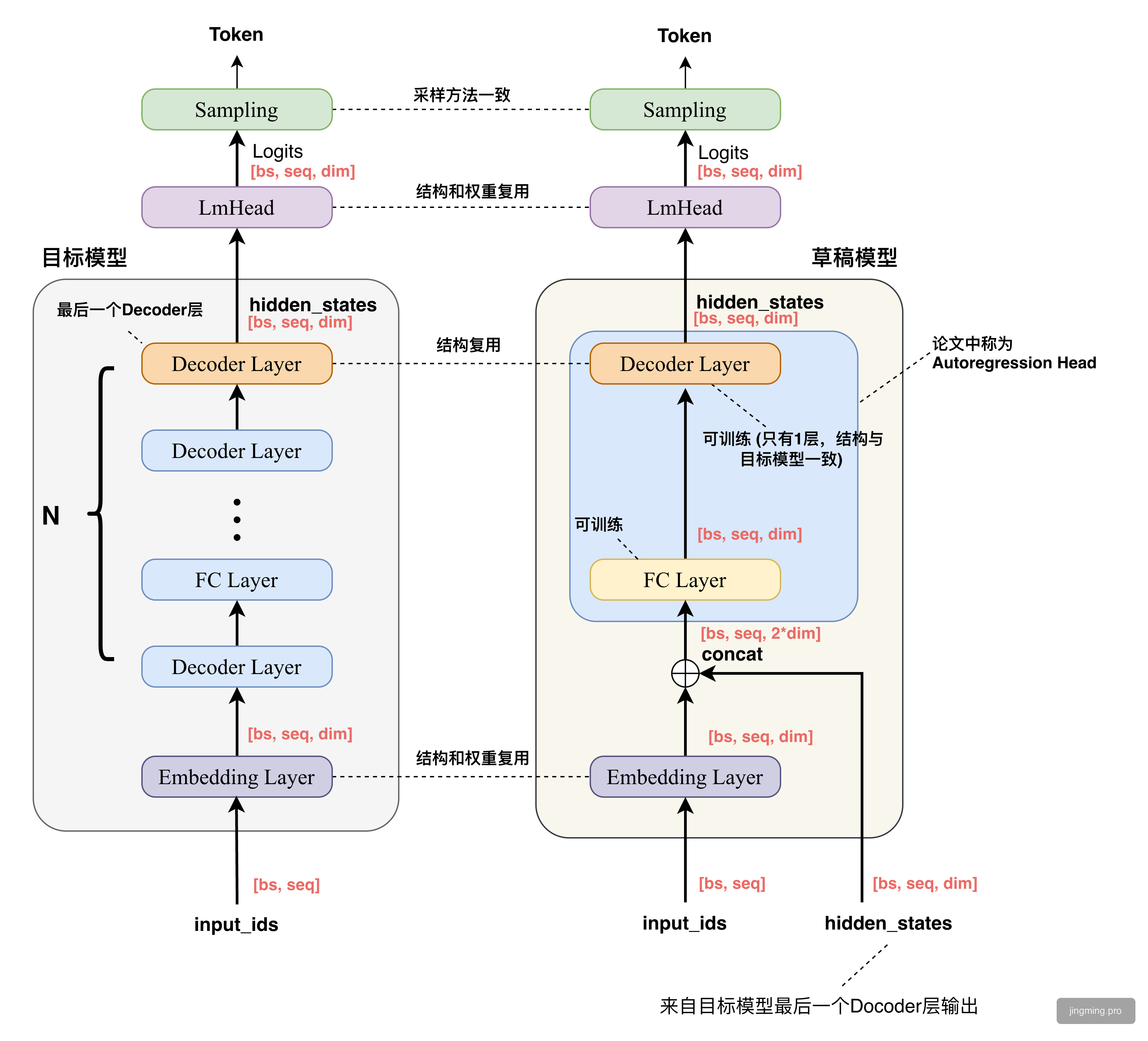 EAGLE 的草稿模型由三个模块组成:Embedding layer、LM Head 和 Autoregression Head。其中,Embedding layer 和 LM Head 直接使用目标 LLM 的参数,无需额外训练。草稿模型的输入包括一个形状为 (bs, seq_len, hidden_dim) 的特征序列,以及一个形状为 (bs, seq_len) 的提前一时间步的 token 序列。随后,模型先将该 token 序列转换为形状为 (bs, seq_len, hidden_dim) 的 token embedding 序列,再与特征序列进行拼接,形成一个形状为 (bs, seq_len, 2 × hidden_dim) 的融合序列。