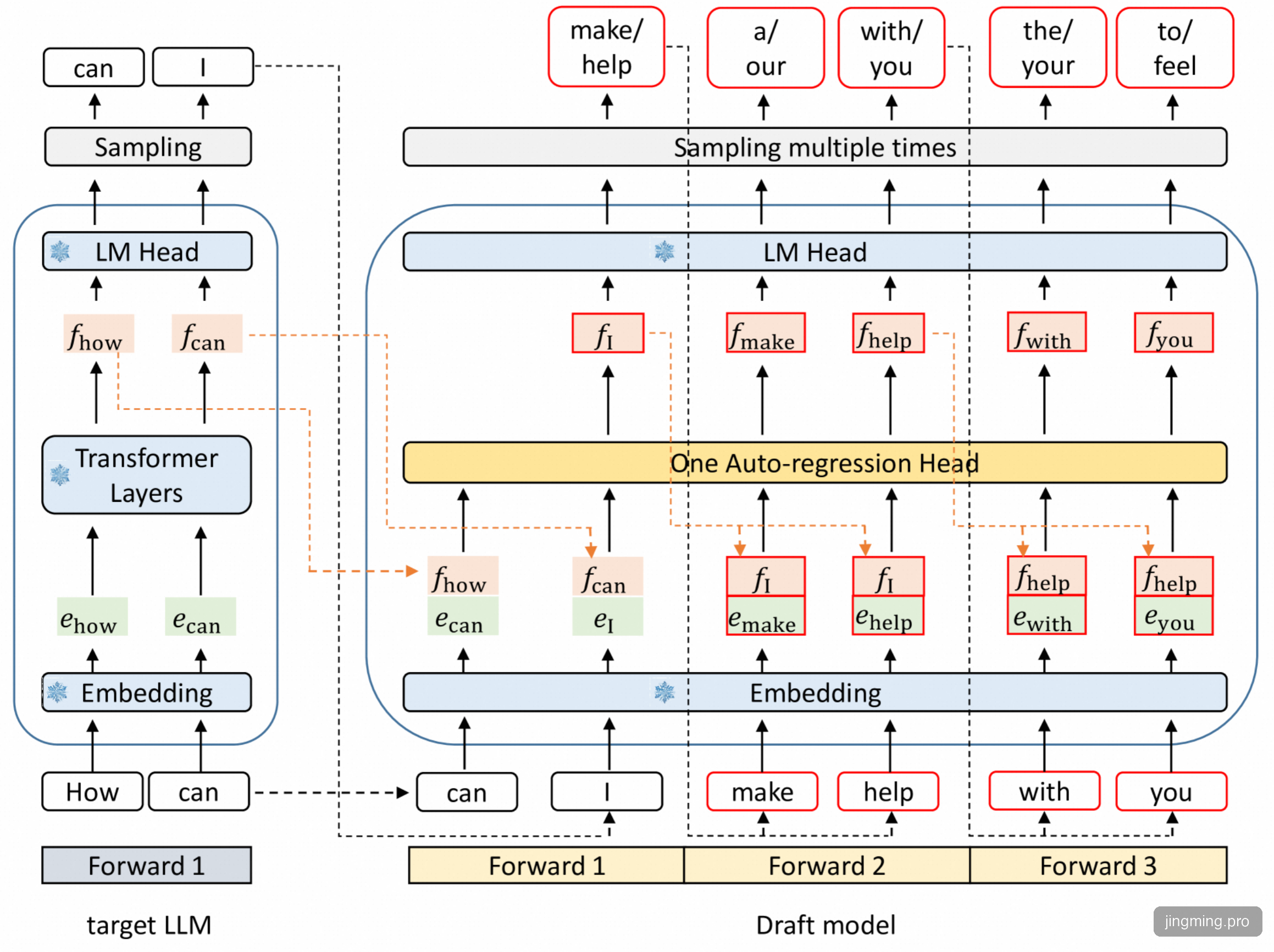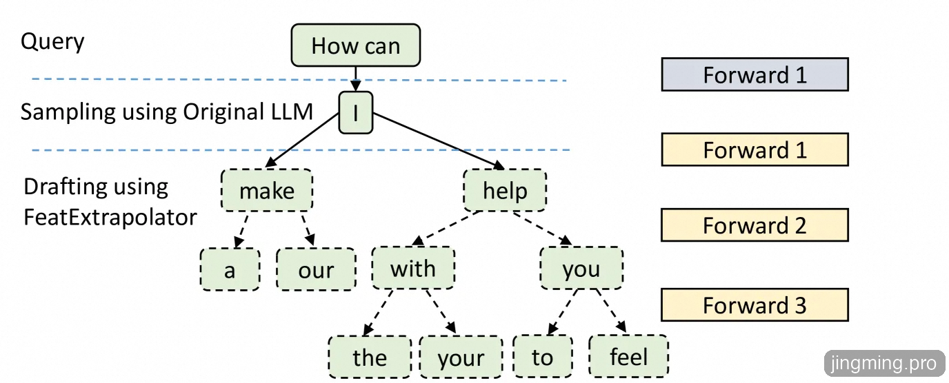 注意,如果要和上面生成的候选Token树保持一致,这个图Forward3流程应该再加上"a", "our"的Forward流程,可能是作者漏掉了。