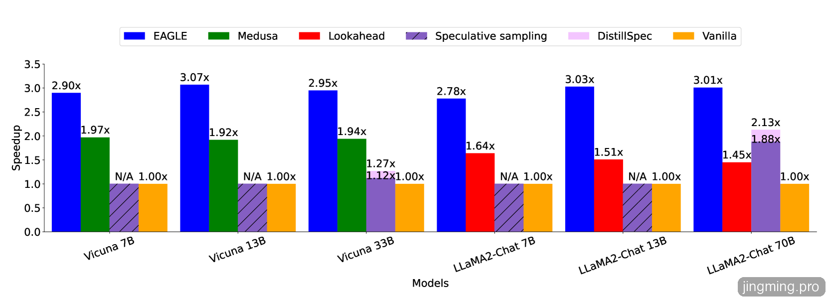 使用在 MT-bench数据集、采用贪婪解码(temperature=0),EAGLE 在所有模型上都取得了最高的推理加速比,整体明显优于 Medusa、Lookahead、Speculative sampling 和 Vanilla等投机采样方法。