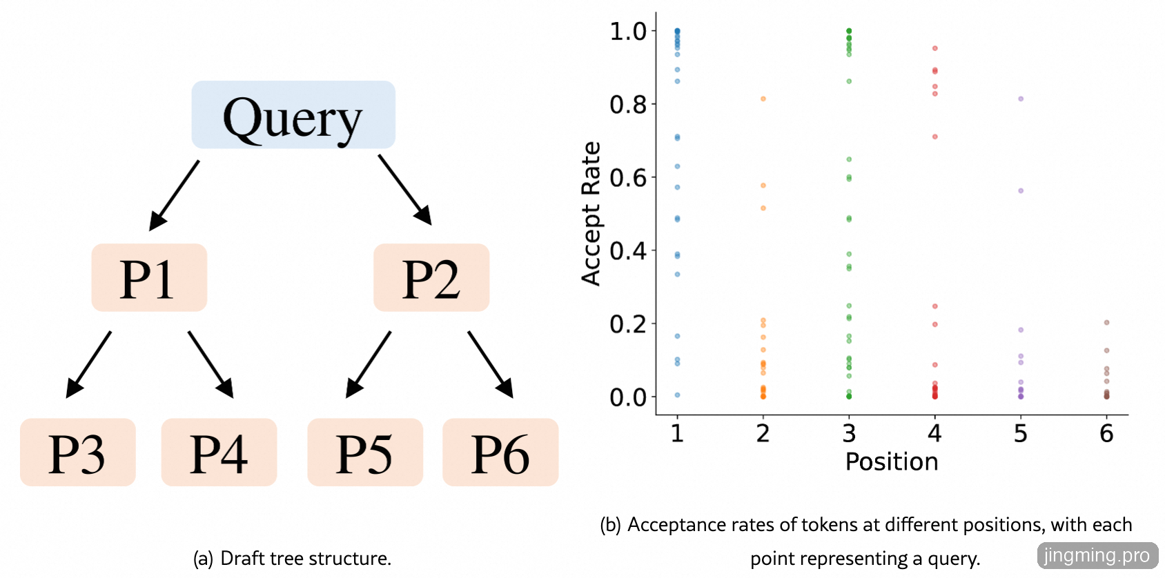 图中左侧的“草稿树”就是EAGLE-1草稿模型最后生成的候选Token树,作者观察发现草稿树Token的接受率与其在树中的位置存在相关性,草稿树左上侧的 token(如位置 P1)通常具有更高的接受率,而右下侧的 token(如位置 P6)接受率较低。而在同一个位置上,接受率仍然存在显著波动(如右图所示,图中的点表示一条 query 在该位置的接受率),表明草稿 token 是否会被接受,不仅取决于其位置也取决于它所在路径前后Token的概率,如果路径总的概率高,那么被目标模型接受的接受率也高,如果路径总概率不高,就裁剪掉这样的路径从而减少计算量。
