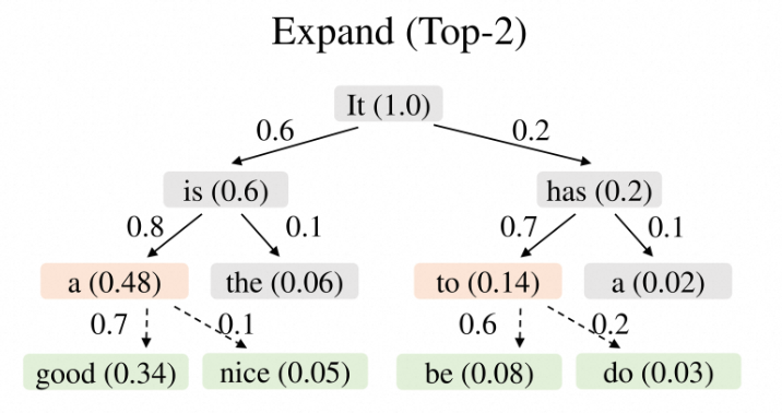 草稿模型可以同时将当前层的所有 token 作为输入,并在一次前向传播中计算它们的下一个 token 概率,从而对当前层所有 token 的同时扩展,这种方式会让Token数量会呈指数级增长,所以肯定要有选择的扩展草稿树,可以看成裁剪。裁剪的方式很简单,每次扩展从当前层中选择全局接受概率最高的 $top-𝑘$ 个 Token 进行扩展,Token $t_i$ 的全局接受率定义为从根节点到$t_i$ 路径上所有 token 概率的乘积,如下图所示: