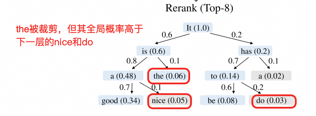 扩展阶段的目的是加深草稿树,但一些被裁剪浅层节点可能全局概率更高,所以直接将扩展阶段选中的 token 作为最终草稿,而是对所有草稿 token 重新排序,并选出取值最高的 $top-m$ 个 token。如下图"the"虽然被裁剪了,但其全局概率高于"nice"和"do",从而过滤掉nice和do,保留"the"。