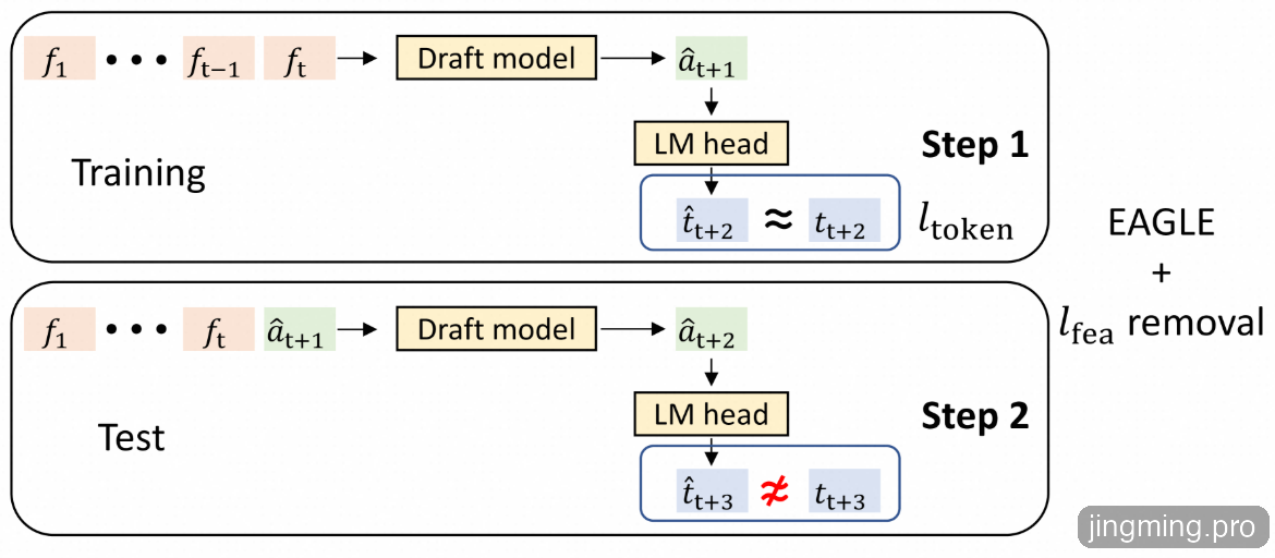 既然特征部分成了限制,那就去掉特征预测的损失函数,只计算Token预测的损失函数$l_{token}$,重新用更多的数据训练草稿模型,这个草稿模型第一个预测出的Token接受率显著提升,但第二次预测的Token接受率非常低。这主要是因为 $\hat{a}_{t+1}$ 与真实特征 $f_{t+1}$ 差异很大,这样第二次预测时输入序列$f_1, f_2, \ldots, f_t, \hat{a}_{t+1}$明显偏离训练分布,导致第二个token接受率非常低。那$\hat{a}_{t+1}$为什么与真实特征$f_{t+1}$变大了?原因也很简单,我们刚去除了特征预测的损失函数$l_{fea}$。