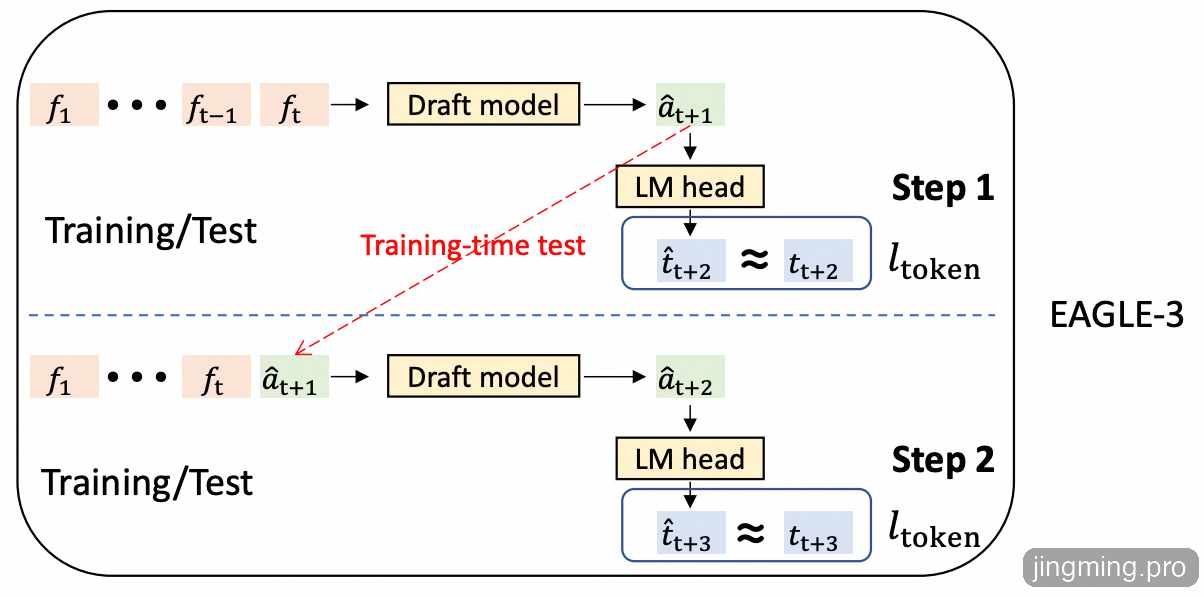 EAGLE-3训练时模拟推理时的多步推测过程(论文中称为 Training-Time Test),相当于考虑了第二次、第三次 ... 到第n次的预测情况,从而解决了这个问题,论文里用下面这个图来解释这个过程,个人感觉很不容易理解,可以参考下面训练时测试部分的代码实现。
