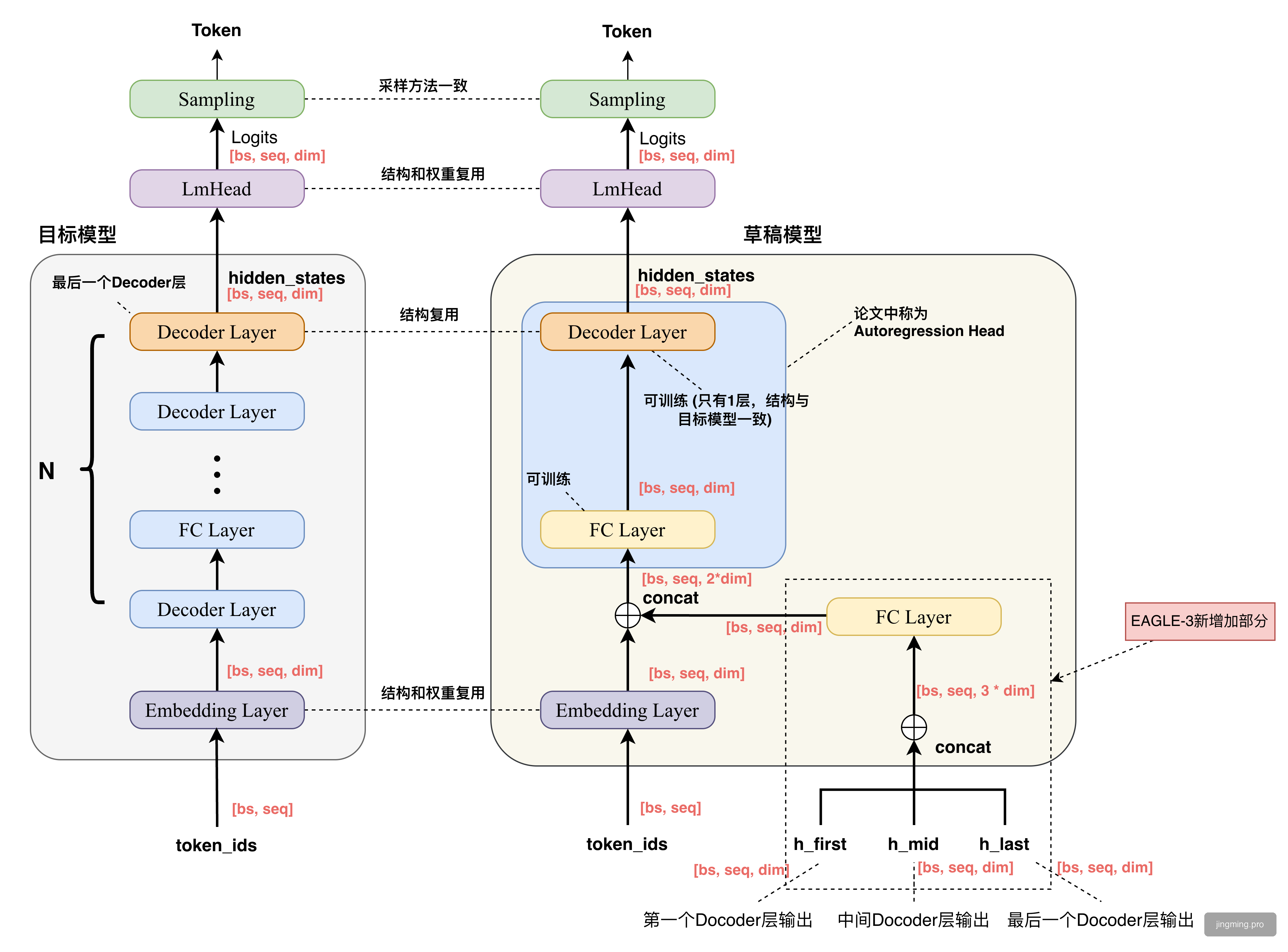 EAGLE1/2中,特征只取最后一层Docoder的输出;EAGLE-3中,对第一层、中间层、最后一层的三个Decoder输出特征进行了特征融合(拼接+FC),如下图右下角所示: