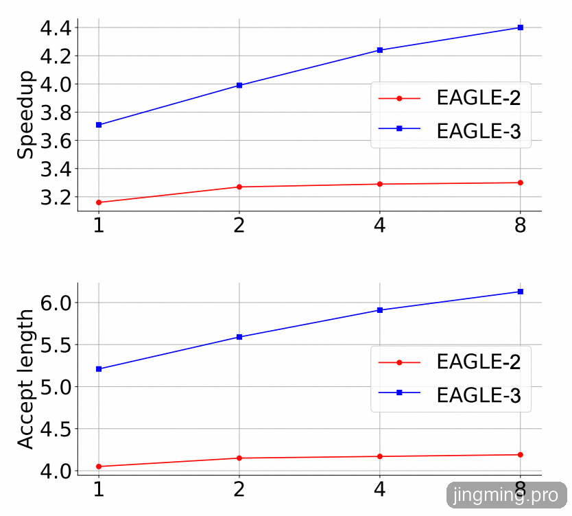 在 MT-Bench 上,以 LLaMA-Instruct 3.1 8B 作为目标模型,横轴表示相对于 ShareGPT 的数据规模。草稿模型随着 训练规模增大,EAGLE-3 的收益会继续上升,而 EAGLE-2 很快就进入平台期。